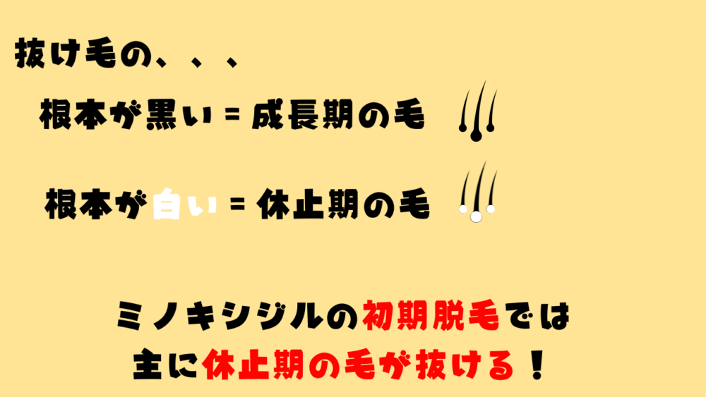 私の抜け毛は根本が白かったので、休止期の毛が押し出されて抜ける、ミノキシジルの正常な反応と考えることができます。