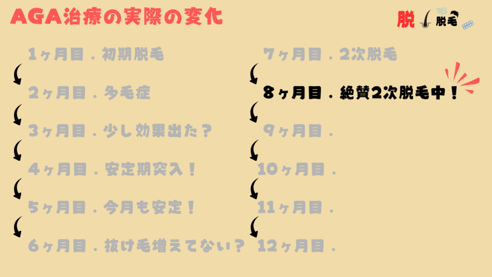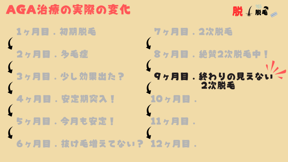 6ヶ月目の終わり頃から2次脱毛が始まっているので、9ヶ月目に入る時点ですでに2ヶ月続いていることになります。