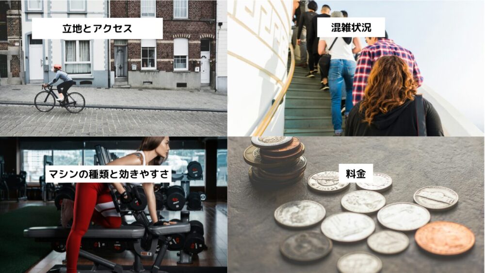 まずは立地とアクセスです。ジムであっても市のトレーニングルームであっても通いやすさはとても大切です。坂の上にあるジムや片道何十分もかかるトレーニングルームなど通いにくさは筋トレ習慣の挫折にも繋がります。
