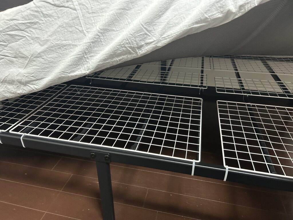 ちなみに私は、ベッドフレームの上にダイソーで買ったワイヤーネットを敷き詰めて、結束バンドで止めて、対策しました。